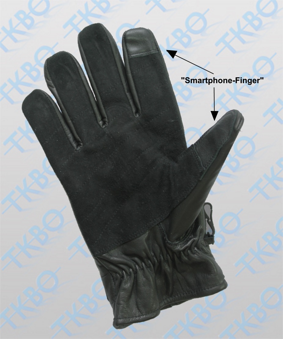 - eingearbeitete "Smartphone-Finger" an Daumen und Zeigefinger zum Bedienen von Touchscreens