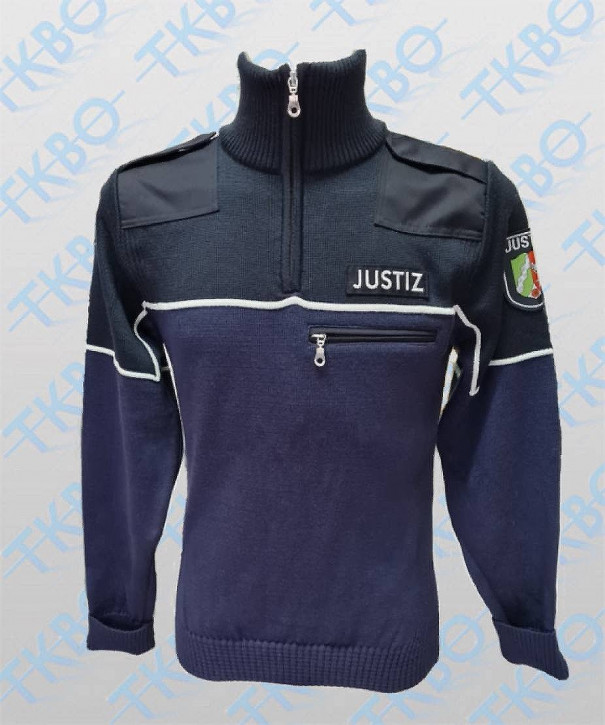 zweifarbig blauer Troyer mit angebrachtem Abzeichen JUSTIZ auf der linken Brustseite sowie angebrachtem Ärmelabzeichen am linken Arm