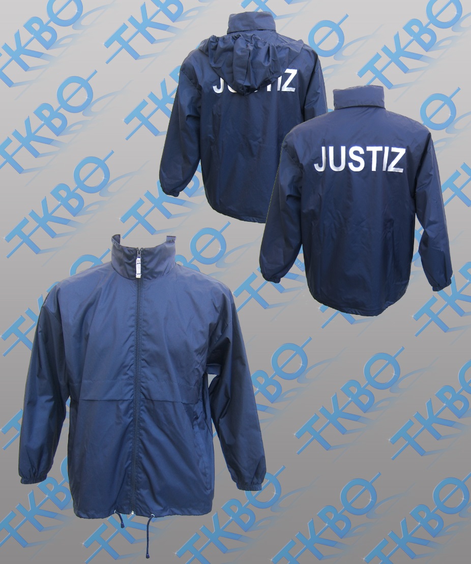 Dunkelblauer Windbreaker mit Rückendruck Schriftzug "Justiz":